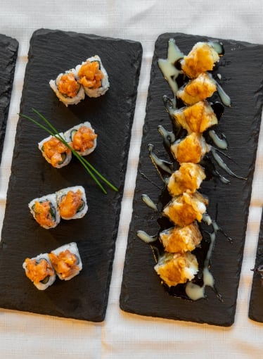 salmone, avocado, tobiko, top burrata, gamberi crudo, tobiko e teriyaki